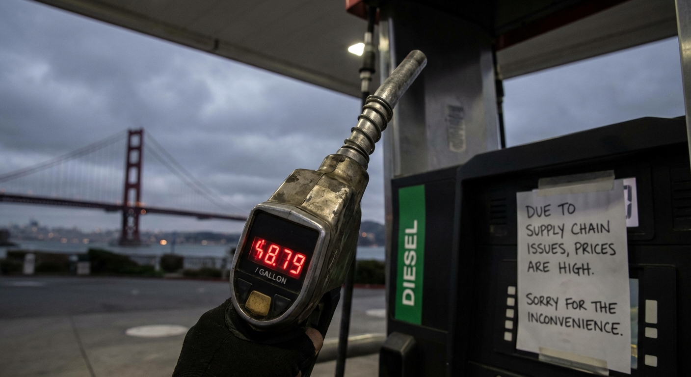 De dieselprijs in San Francisco is tot boven $8 gestegen. Dit komt door een energiecrisis in de Golf en zwak beleid in Californië. Jaren van "groene" plannen en hoge belastingen maakten Californië afhankelijk van buitenlandse olie. Dit maakt de staat kwetsbaar voor schokken op de wereldmarkt.